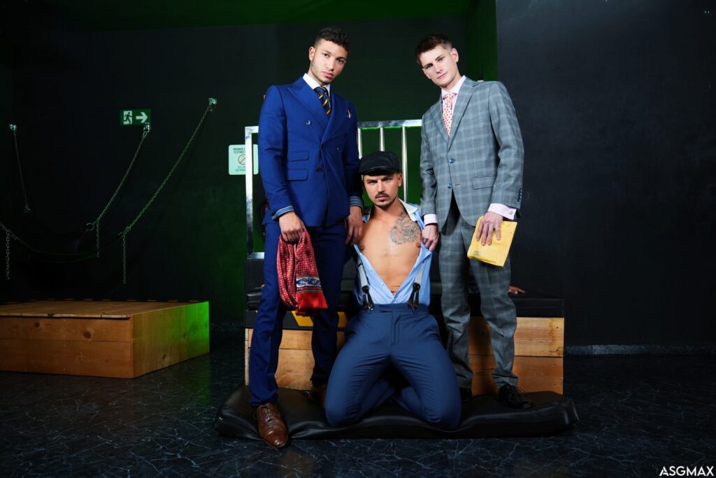 When the usual collector is unavailable, Vincent “The Voice” Grey joins Trevor “Skinny” Harris to handle the job. Vincent steps in for the usual bagman, flanked by Trevor. But the owner, Tom Storm, is light on the pizzo. Too light. Vincent alerts Tom that they’re going to collect payment one way or another and binds Tom’s hands behind his back. After getting stuffed by both cugine, Tom lies in the middle of a three-way anal train: fucking Vincent while simultaneously getting plowed by Trevor. The threesome fuck session in place of full payment ends with a warning. Tom better have all of MrDeepVoice’s money next week, Bagman won’t be so forgiving!